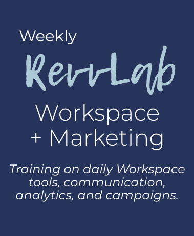 We offer two recurring RevvLab trainings each week: AI HQ every Tuesday and Workspace + Marketing every Wednesday. Both sessions always run at the same time each week, and that time rotates weekly.